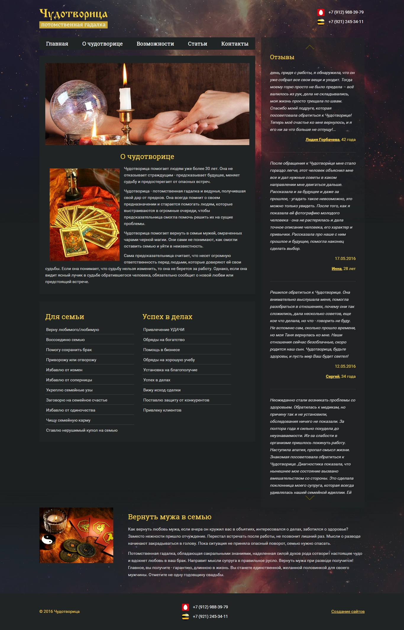Чарующий сайт потомственной гадалки, он наполнен магией и силой Чудотворицы. Фирменный сайт уместил в себя все услуги, статьи, а так же отзывы всех клиентов потомственной гадалки. Чудотворица помогает людям уже более 30 лет.