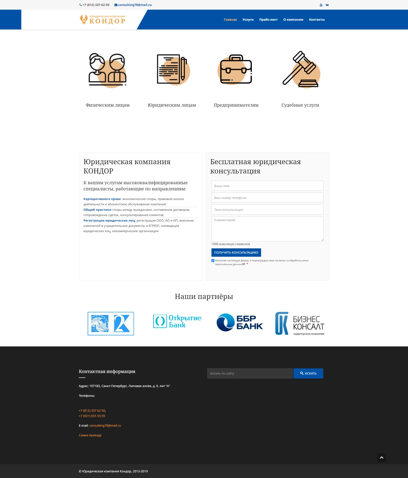 При создании дизайна сайта учитывались не только логотип и айдентика компании, но так же и сами юристы, их одежда и атрибуты профессии.